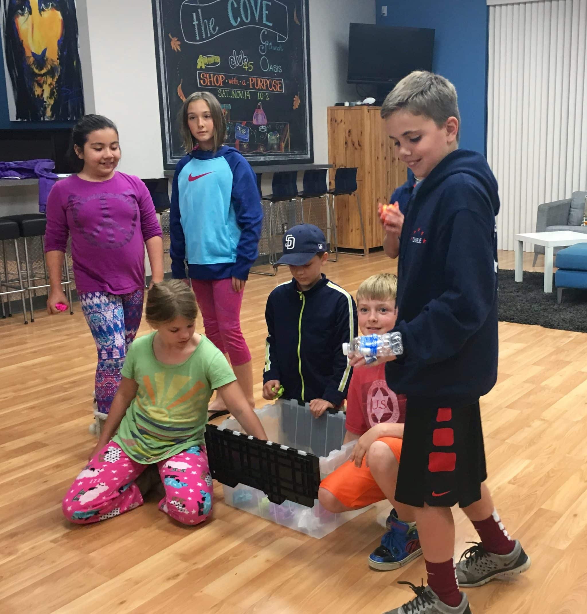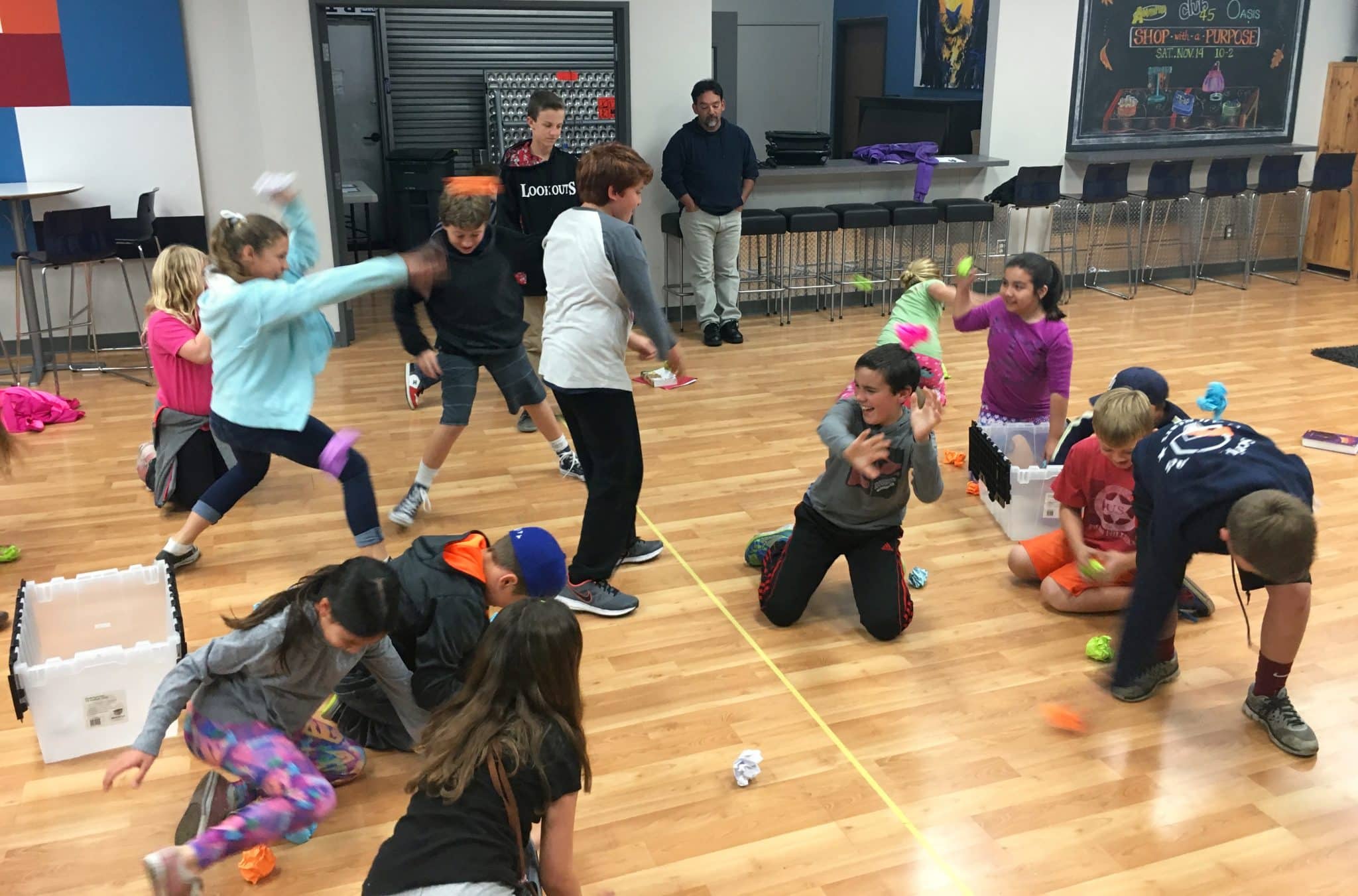 Then Ms. Chrissy divided the clubbers into two groups – and they had a fruit fight! There was a line down the middle and each team had a bin full of wadded up, colored paper. On the word “go”, each team had to throw their papers to the other side and the other team had to try to throw them back. The team with the least amount of paper “fruit” won. After the game, Ms. Chrissy explained that sometimes we need more fruit to win the “fight.” The whole thing resulted in starbursts for everyone! :)