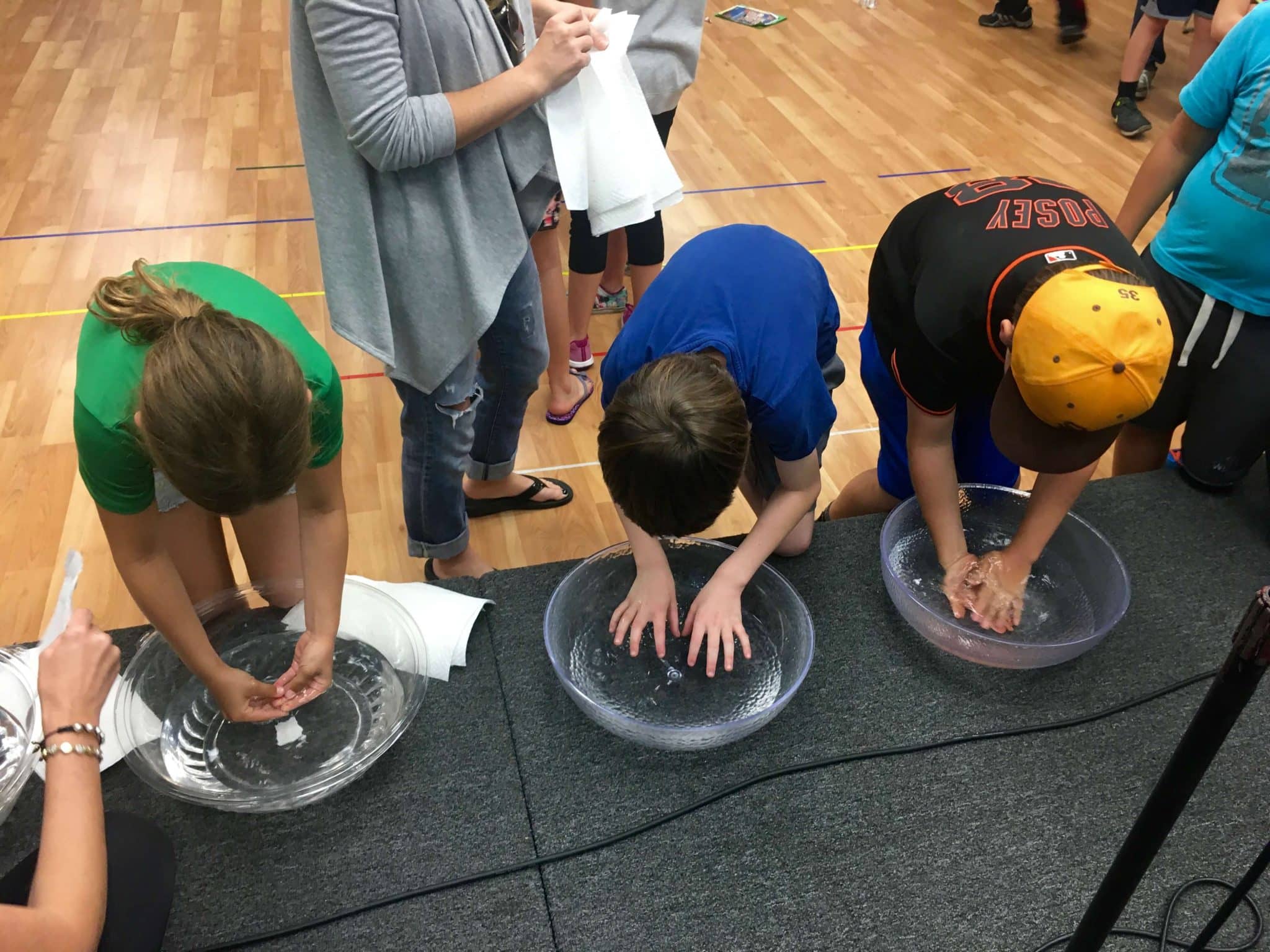During Club Teaching Time we reviewed the Ten Commandments as a group. Each of the commandments was posted around the room; the group started in front of the first commandment. We recited it together and then Ms. Betsy read from a story called Dallas Understands. If they had broken the commandment from the story, then the children received a red mark on one of their fingers. At the end, most had dots on each of their fingers. Then they each received a red cross with permanent marker in the center of their palms, symbolizing Jesus dying on the cross. We had bowls of water at the front; each child washed their hands and said out loud, “My sin is real.” When they wiped their hands with paper towels, the red marks on their fingers were gone – but the mark representing Jesus remained. Jesus forgives our sins when we have Him in our life.