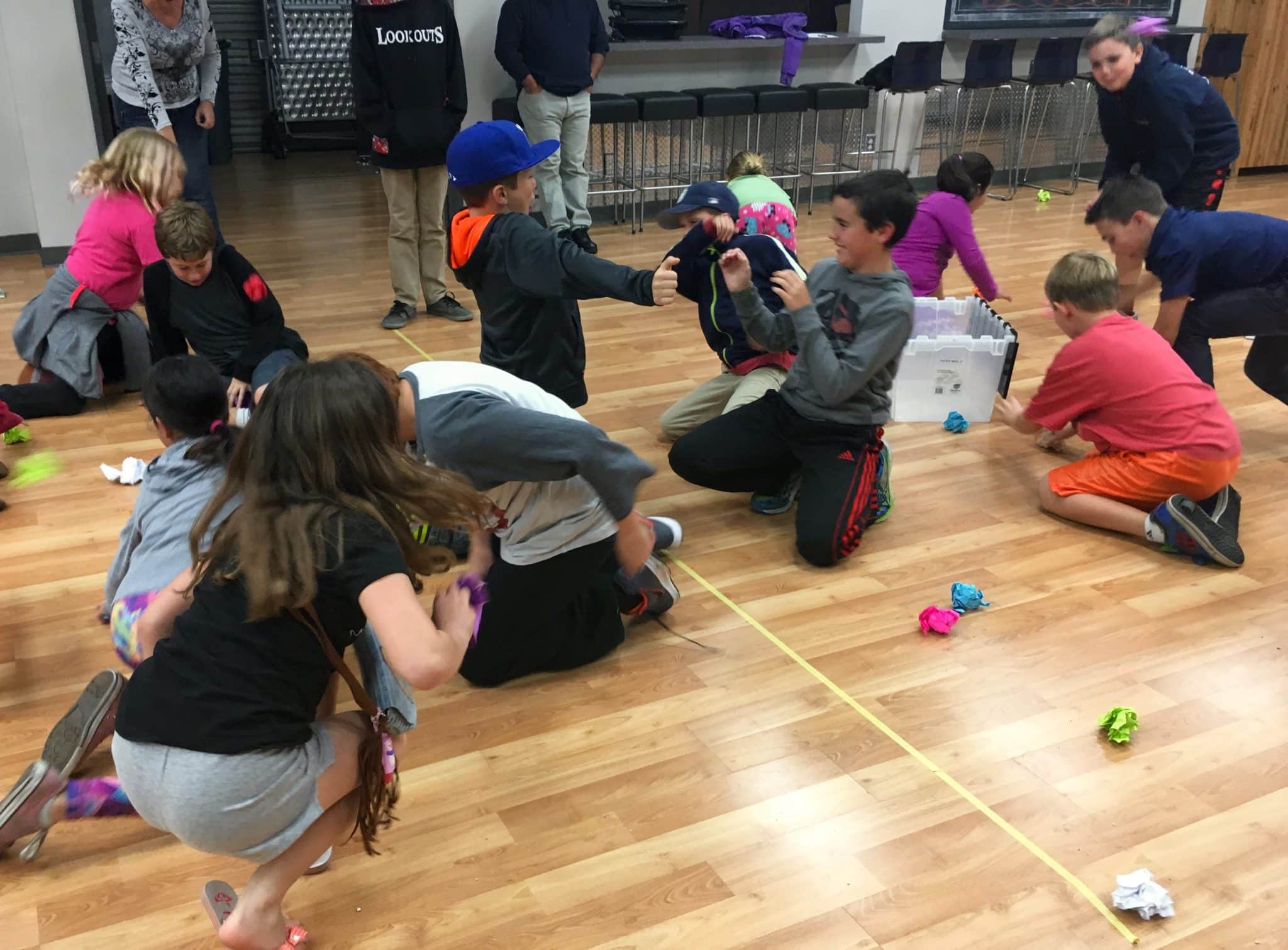 Then Ms. Chrissy divided the clubbers into two groups – and they had a fruit fight! There was a line down the middle and each team had a bin full of wadded up, colored paper. On the word “go”, each team had to throw their papers to the other side and the other team had to try to throw them back. The team with the least amount of paper “fruit” won. After the game, Ms. Chrissy explained that sometimes we need more fruit to win the “fight.” The whole thing resulted in starbursts for everyone! :)