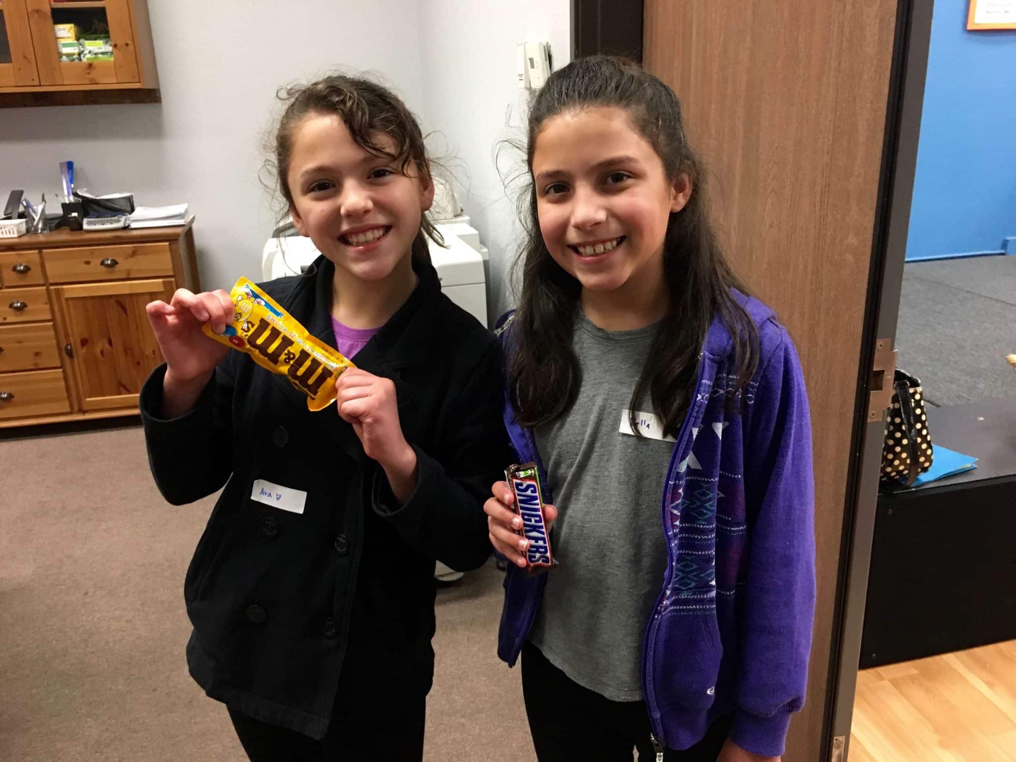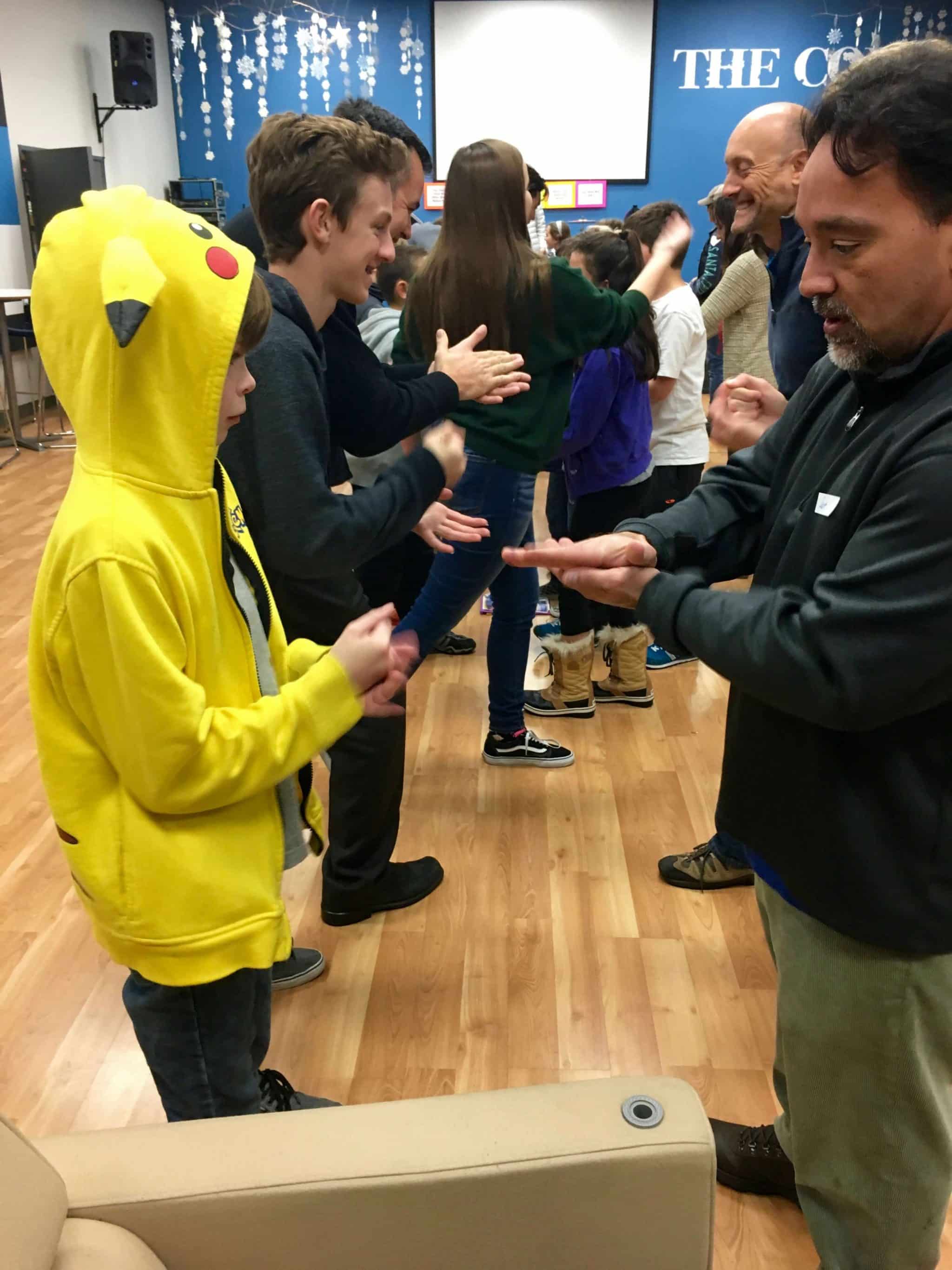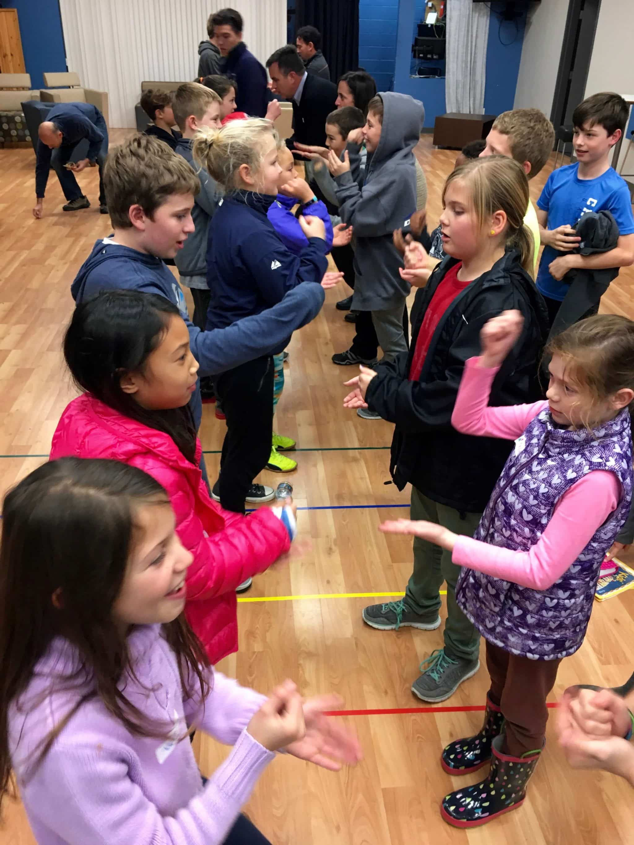 Our first mixer was Rock/Paper/Scissors – with the whole group! The kids and leaders paired up, did rock/paper/scissors three times to determine a winner and it dwindled down to a final winner – Bryce Wiley! Our second mixer was a version of musical chairs – without chairs. The winners of this game were Ava and Bella Chambers!