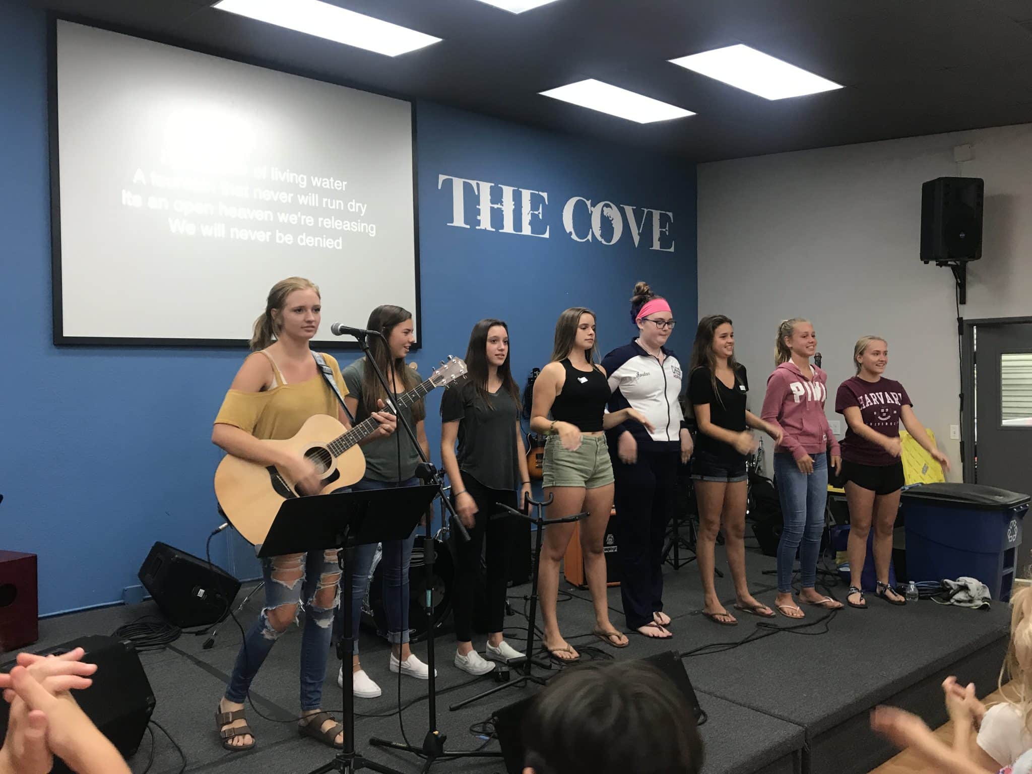 Next was our worship time. Sterling Hawkins played the guitar and lead us in singing two worship songs; our high school girl leaders taught us the hand motions from the stage.